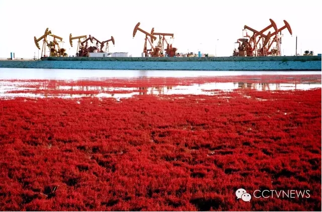 Between September and October each year, a beach in Panjin, a city in northeast China’s Liaoning Province, is transformed into crimson red. Seepweed grows red along its shore, turning it to a sea of red.
